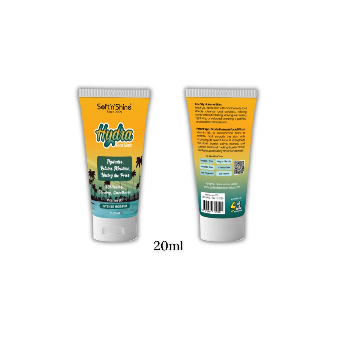 Refresh your skin with the deep hydration of Hydra Face Wash by Soft n Shine. Formulated with Vitamin B3 (Niacinamide), this spa-grade cleanser helps retain moisture, purify pores, and promote visibly clearer, smoother skin.